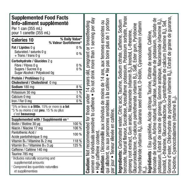 Ingredients: Carbonated Water, Citric Acid, Taurine, Sodium Citrate, Caffeine, Sodium Benzoate, Natural Flavour, Sucralose, Acesulfame Potassium, Potassium Sorbate, Panax Ginseng Root Extract, Gum Arabic, Niacinamide (Vitamin B3), Inositol, L-Theanine, Glucuronolactone, D-Calcium Pantothenate (Vitamin B5), Salt, Ester Gum, Pyridoxine Hydrochloride (VItamin B6), Guarana Seed Extract, D-Biotin, Cyanocobalamin (Vitamin B12).