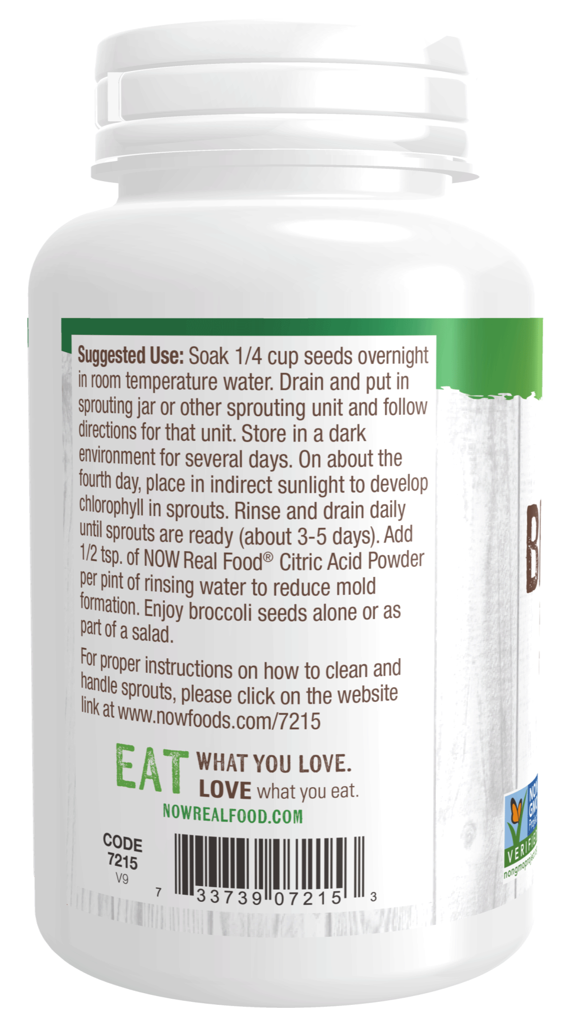 Soak 1/4 cup seeds overnight in room temperature water. Drain and put in sprouting jar or other sprouting unit and follow directions for that unit. Store in a dark environment for several days. On about the fourth day, place in indirect sunlight to develop chlorophyll in sprouts. Rinse and drain daily until sprouts are ready (about 3-5 days). Add 1/2 tsp. of NOW Real Food® Citric Acid Powder per pint of rinsing water to reduce mold formation. Enjoy broccoli seeds alone or as part of a salad.