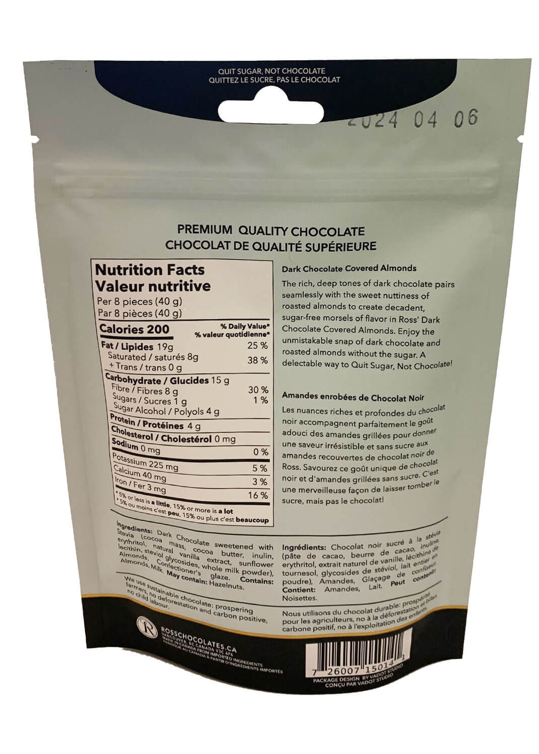 Sugar-free, keto-verified Ross Sugar-Free Dark Chocolate Covered Almonds hit the spot every time. The delicate flavour of almonds combines with the rich, full bodied flavour of Ross Dark Chocolate to create a taste explosion that ends in a crisp, crunchy snap!