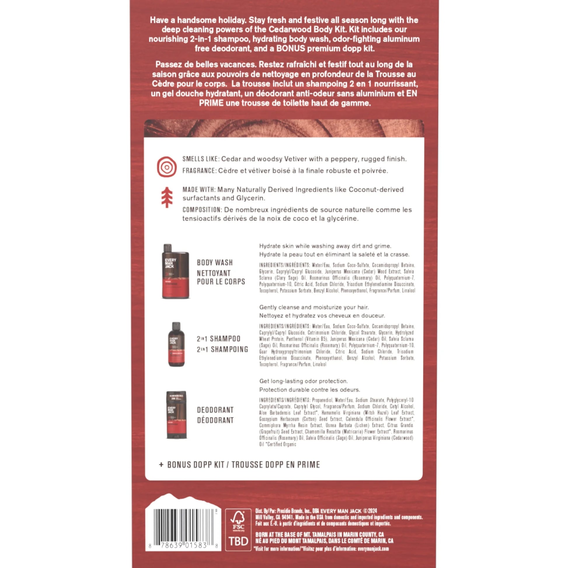 - ROUND OUT HIS ROUTINE: Specially designed to cleanse, condition, and hydrate from head to toe; body care set includes Cedarwood Body Wash, 2-in-1 Shampoo + Conditioner, Aluminum Free Deodorant, plus a Bonus Dopp bag!
