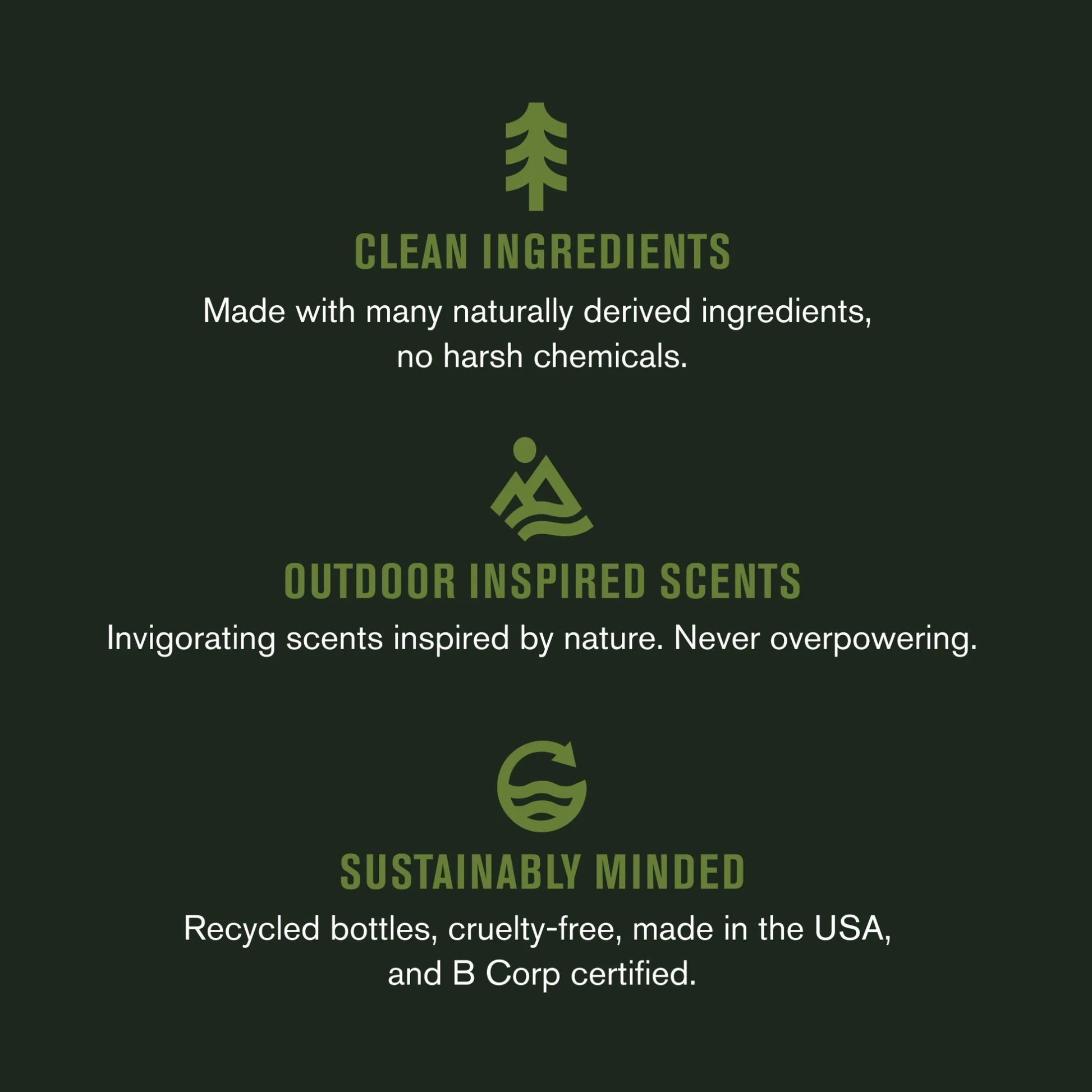 We strive to use as many naturally derived and plant-based ingredients as possible, while still delivering exceptional performance. No parabens. No phthalates. No dyes. No GMOs. No aluminum. And never tested on animals.