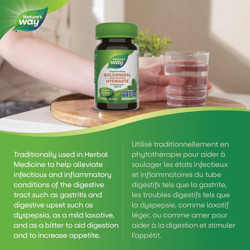 Nature's Way Goldenseal Root is traditionally used in Herbal Medicine to help alleviate infectious and inflammatory conditions of the digestive tract such as gastritis and digestive upset such as dyspepsia, as a mild laxative, and as a bitter to aid digestion and to increase appetite. Nature's Way Goldenseal Root is Vegetarian and Non-GMO Project Verified.