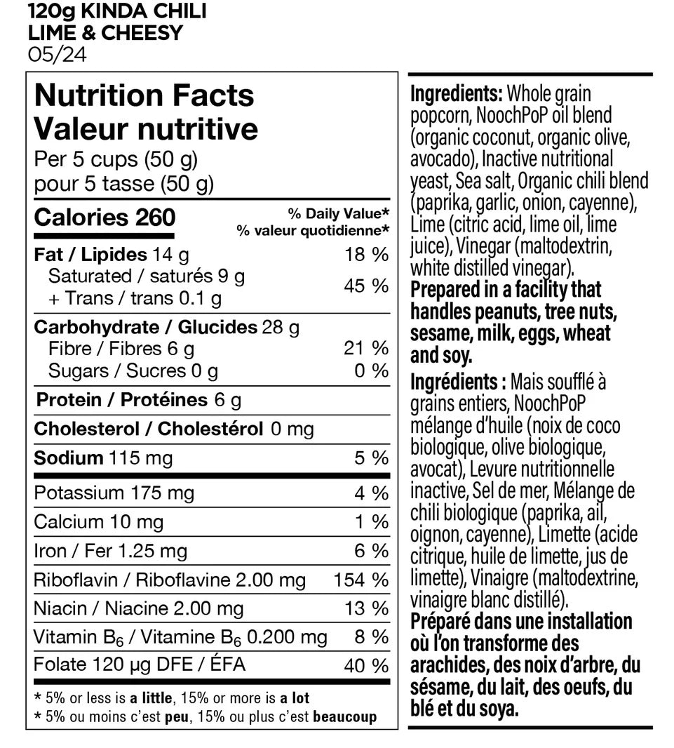 Ingredients: Whole grain popcorn, NoochPOP oil blend (organic coconut, organic olive, avocado), Inactive nutritional yeast, Sea salt, Organic chili blend (paprika, garlic, onion, cayenne), Lime (citric acid, lime oil, lime juice), Vinegar (maltodextrin, white distilled vinegar).