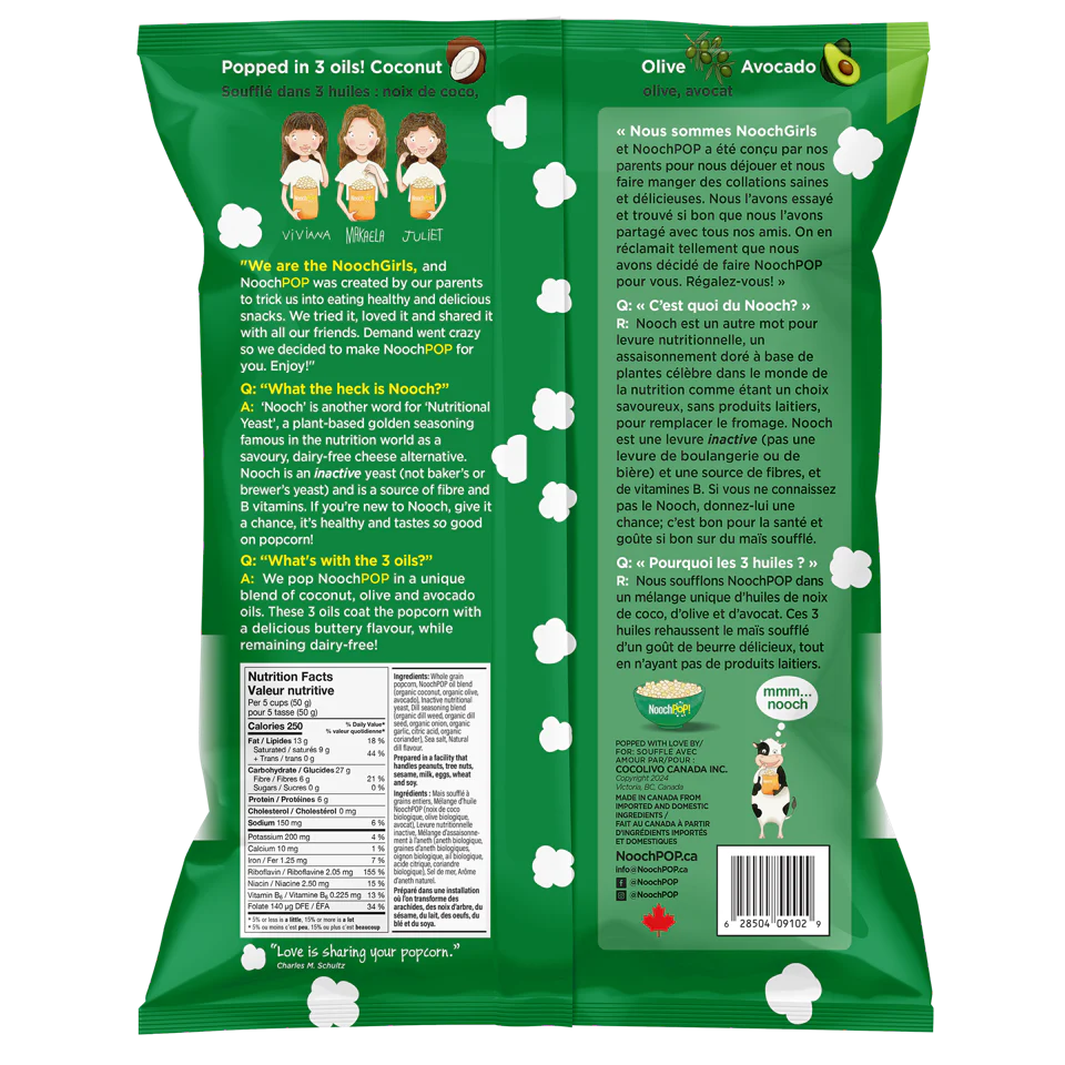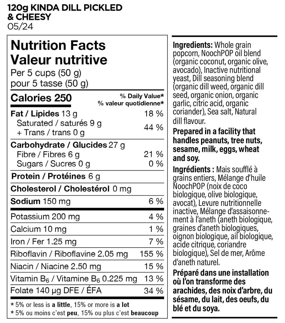 Ingredients: Whole grain popcorn, NoochPOP oil blend (organic coconut, organic olive, avocado), Inactive nutritional yeast, Dill seasoning blend (organic dill weed, organic dill seed, organic onion, organic garlic, citric acid, organic coriander), Sea salt, Natural dill flavour.