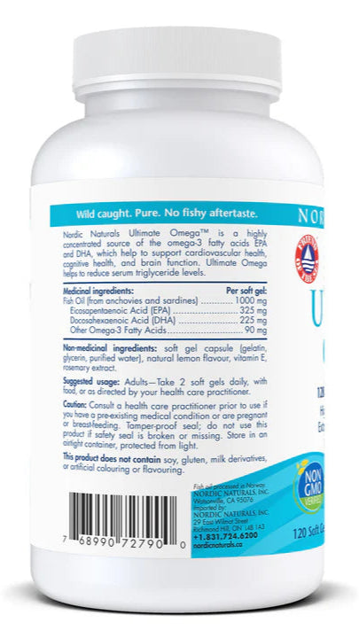 Nordic Naturals most popular concentrate, Ultimate Omega contains 1280 mg of omega-3s per serving. A serving of Ultimate Omega exceeds the daily recommended dose and has been shown to support a healthy heart. Each serving delivers concentrated EPA and DHA in true triglyceride form for optimal absorption. Without solicitation, doctors and researchers worldwide choose and recommend this powerful formula. Ultimate Omega meets European Pharmacopoeia Standards Molecularly distilled for purity in a great-tasting lemon flavour.
