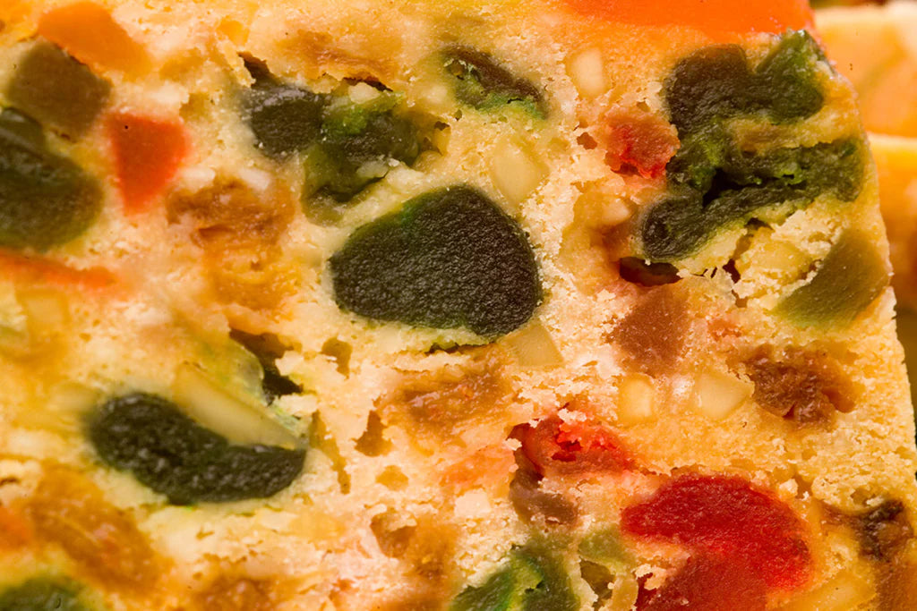 Ingredients: glace cherries, glace mix, glace pineapple wedges (cherries, papaya, pineapple, sugar and/or glucose-fructose, glucose, citric acid, sodium benzoate, artificial flavor, malitol, calcium chlorate), flour, raisins (sulphites), butter, sugar, crushed pineapple, whole eggs, almonds, cream, unsweetened coconut (sulphites), natural and artificial flavour, baking powder, potassium sorbate.