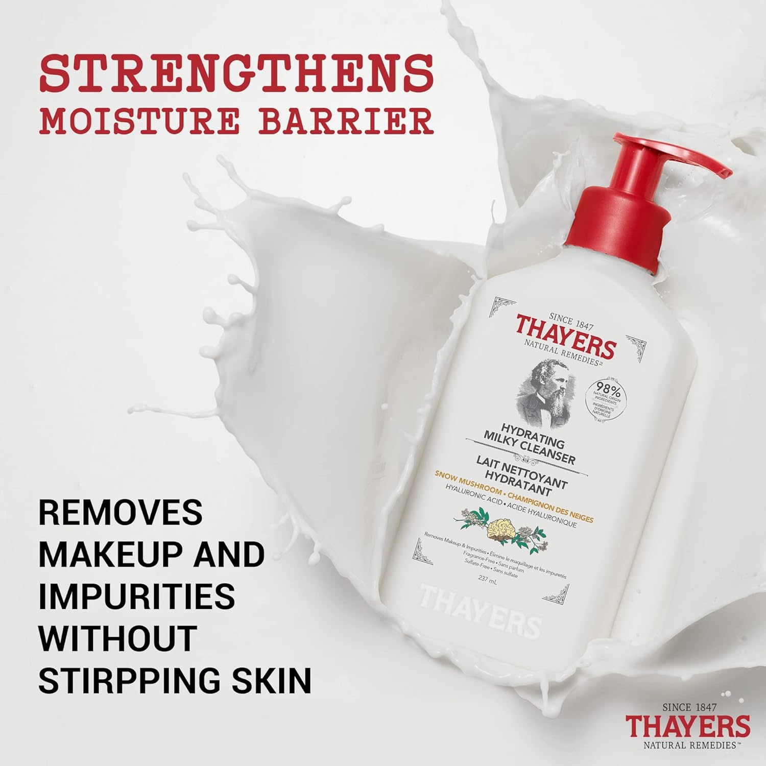 Thayers Hydrating Milky Cleanser is the first step to your best bare skin yet. Gently cleanse away makeup, dirt, oil, and impurities while strengthening your skin’s moisture barrier. This silky-smooth, creamy facial cleanser harnesses the power of Hyaluronic Acid in tandem with our hydrating plant hero, Snow Mushroom. This unique blend works overtime to hydrate and deeply cleanse without stripping. This gentle cleanser will leave your skin feeling clean, soft, cushioned, and smooth. With 98% natural origin ingredients, our formulas are fragrance-free, alcohol-free, cruelty-free, non-comedogenic. Our facial cleanser is ophthalmologist and dermatologist tested for safety. For best results, follow with Thayers Hydrating Milky Toner.