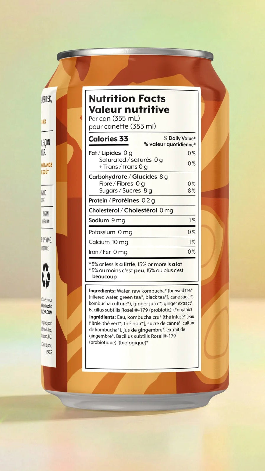 Ingredients (all organic): water, raw kombucha (brewed tea [filtered water, green tea, black tea], cane sugar, kombucha culture), ginger juice, ginger extract, Bacillus subtilis Rosell®-179 (probiotic).